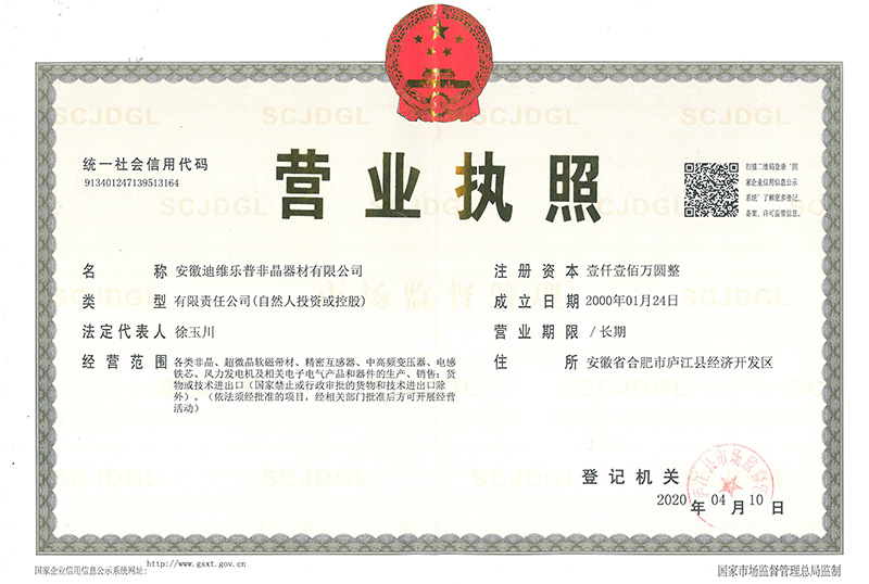 • 安徽迪維樂(lè)普非晶器材有限公司2019年安徽省“專(zhuān)精特新”中小企業(yè)名單的公示